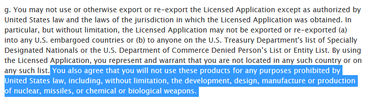 "Du (brugeren) medgiver, at du ikke vil bruge disse produkter til formål, som er forbudt under amerikansk lov, herunder uden begrænsninger udvikling, design, fremstilling og produktion af atommissiler eller kemiske eller biologiske våben."