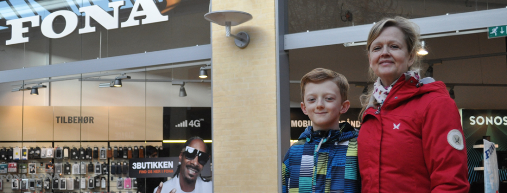 Skilte i vinduet lokker med "Cool dage" og "Hotte priser", mens rapperen Snoop Dogg med guldbelagte tænder og et trefingers-håndtegn vil have os til at vælge Fonas tele-butik, som drives i samarbejde med tele-selskabet 3.