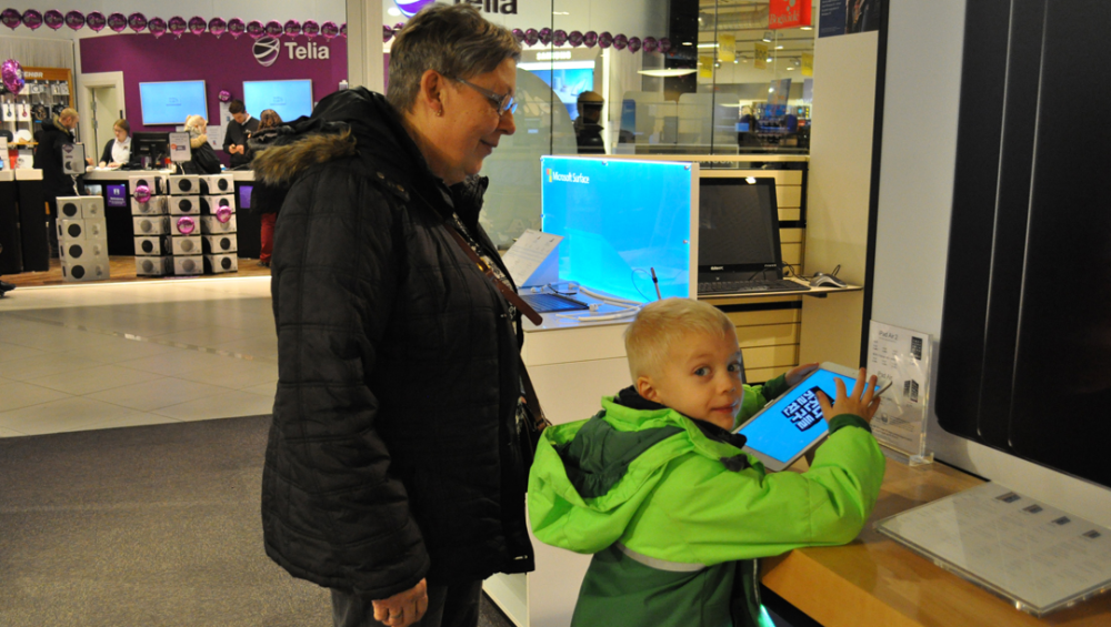 Lige ved indgangen kigger Hanne Hansen interesseret på sit barnebarn, der hjemmevant swiper rundt på en iPad.