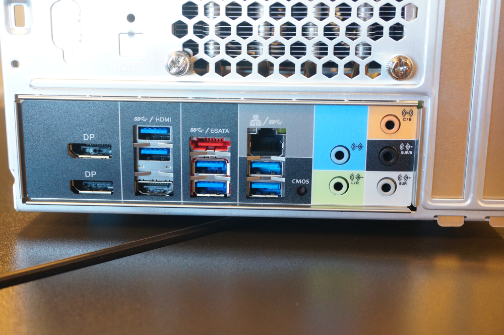 Bundkortets bagside byder på support til op til tre skærme to display-porte og en HDMI), 4K-afspilning, otte USB 3.0-porte, eSATA-port, Intel Gigabit LAN, og 7,1 HD audioporte. Det eneste vi for alvor mangler, var et enkelt USB type C-stik, så man var lidt mere fremtidssikret, men det er en petitesse.