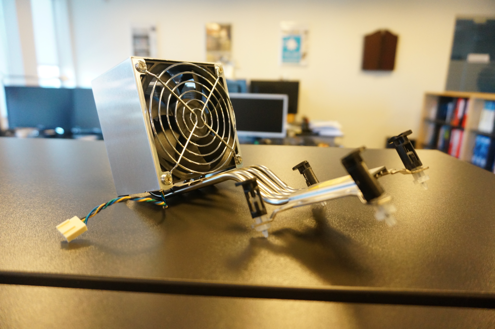 Nu tænker du nok, at så lille en computer, med to harddiske, motherboard, processor, og et PCI-e grafikkort i fuld længe nok afgiver for meget varme til, at den lille computer kan klare det.