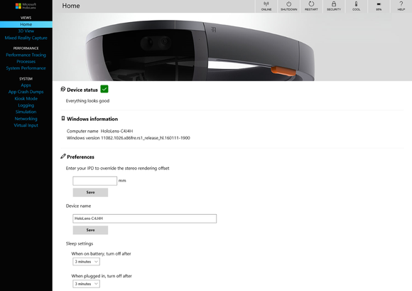 Microsoft har lavet en speciel version af sin Device Portal til HoloLens. Det er et program, hvor du kan få fuldt overblik over din HoloLens tilstand. Du kan blandt andet se dens temperatur, dens performance, forbinde den til et netværk, genscanne et rum for bedre at placere AR-objekter, eller endda skrive beskeder til, som vil svæve foran brillerne.