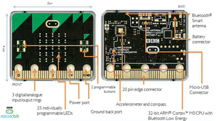 Micro Bit har eksempelvis 25 programmerbare led-pærer, to programmerbare knapper og har indbygget accelerometer, USB-port, Bluetooth LE og fem ind- og udgange, der kan tilsluttes med krokodillenæb.