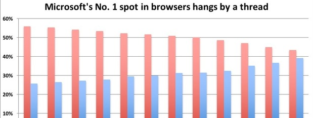 Sammenlagt har de to Redmond-producerede browsere lige nu en andel af markedet på 43 procent. For bare et år siden var den del på 57 procent.