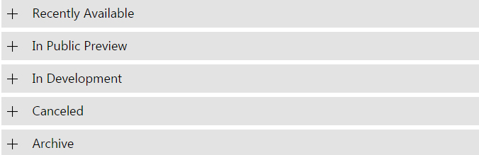 Microsofts Windows-roadmap er delt op i fem kategorier - recently available, in public preview, in development, canceled og archieve (se topfoto).