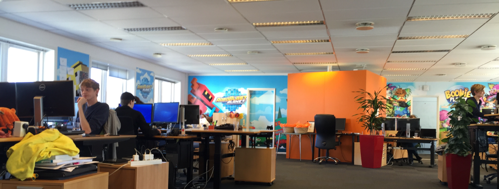 Det første, der møder dig, når du står ud af elevatoren på 2. sal i The Orbit, er et stort væg-maleri, der forestiller figurerne i Moviestarplanet-universet.