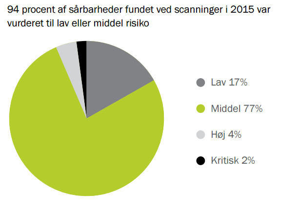 Langt hovedparten (94 procent) af sårbarhederne, der er fundet gennem skanninger, er dog rimelig ufarlige. Kun seks procent bliver placeret i kategorierne Høj risiko og Kritisk.