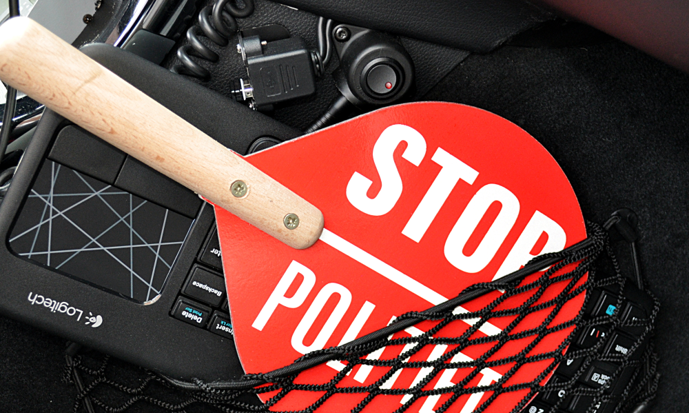 Betjenten ved min side har nu aktiveret bilens blink for at vinke den forankørende Ford-kassevogn ind til siden. It-systemet har genkendt nummerpladen, og på skærmen i politibilen bliver det oplyst, at bilen ikke har overholdt syn.