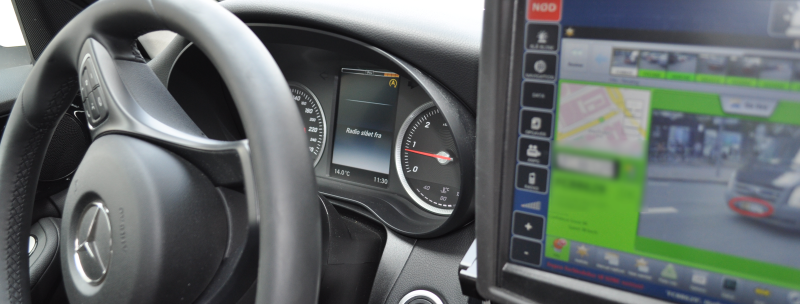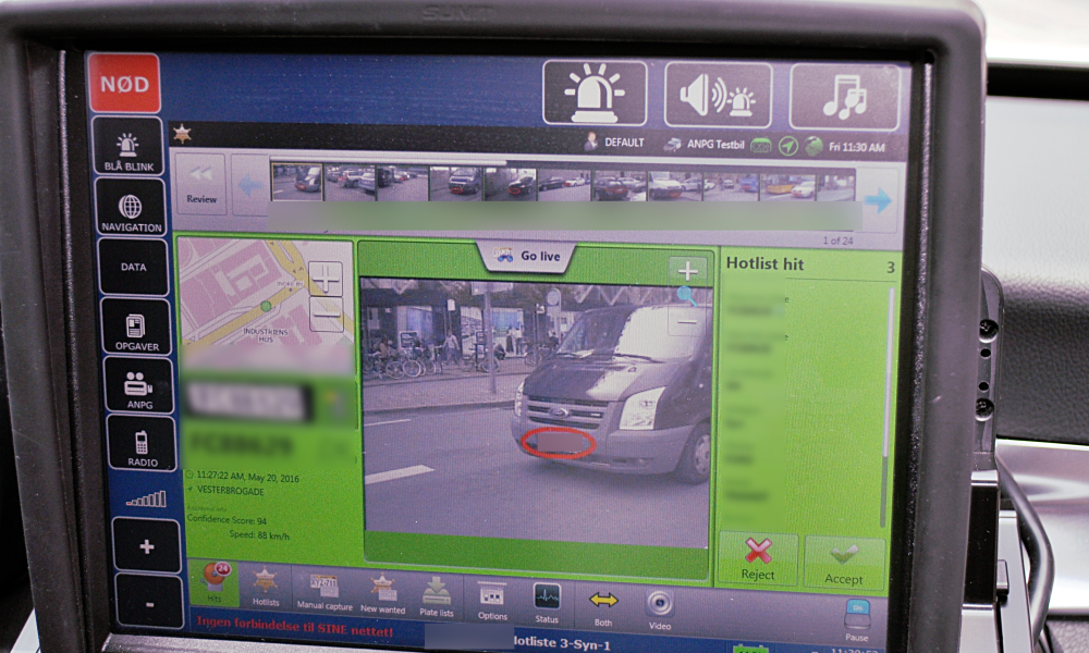 Vi er netop kørt ud på Vesterbrogade tæt på Tivoli i København, da skærmen i politibilen alarmerer med både lyd og et skærmbillede af en nummerplade fra en blå varebil.