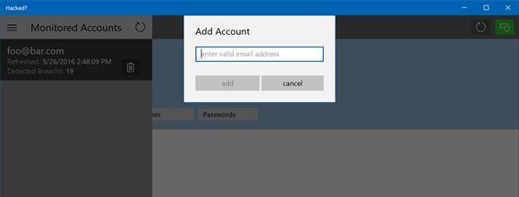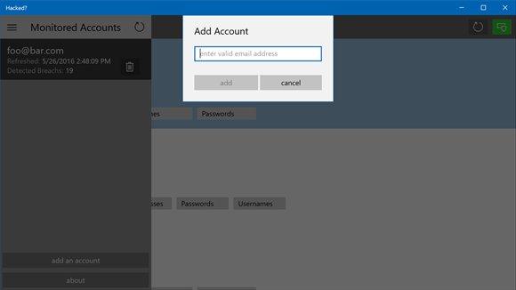 Hacket? fungerer på den måde, at man indtaster sin email-adresse i appen, hvorefter den (eller de) indgår i monitoreringen.