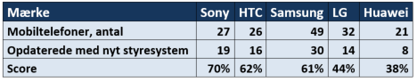 Omvendt er Sony det mobilselskab, der mellem 2012 og 2015 har været bedst til at få opgraderet sine telefoner, men Sony har stadig en tredjedel telefoner, som aldrig har modtaget en opdatering.