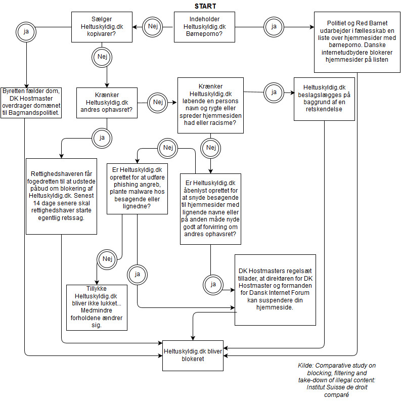 Vi har set nærmere på kapitlet om Danmark og udarbejdet et diagram over, hvad der skal til, for at lukke en dansk hjemmeside.