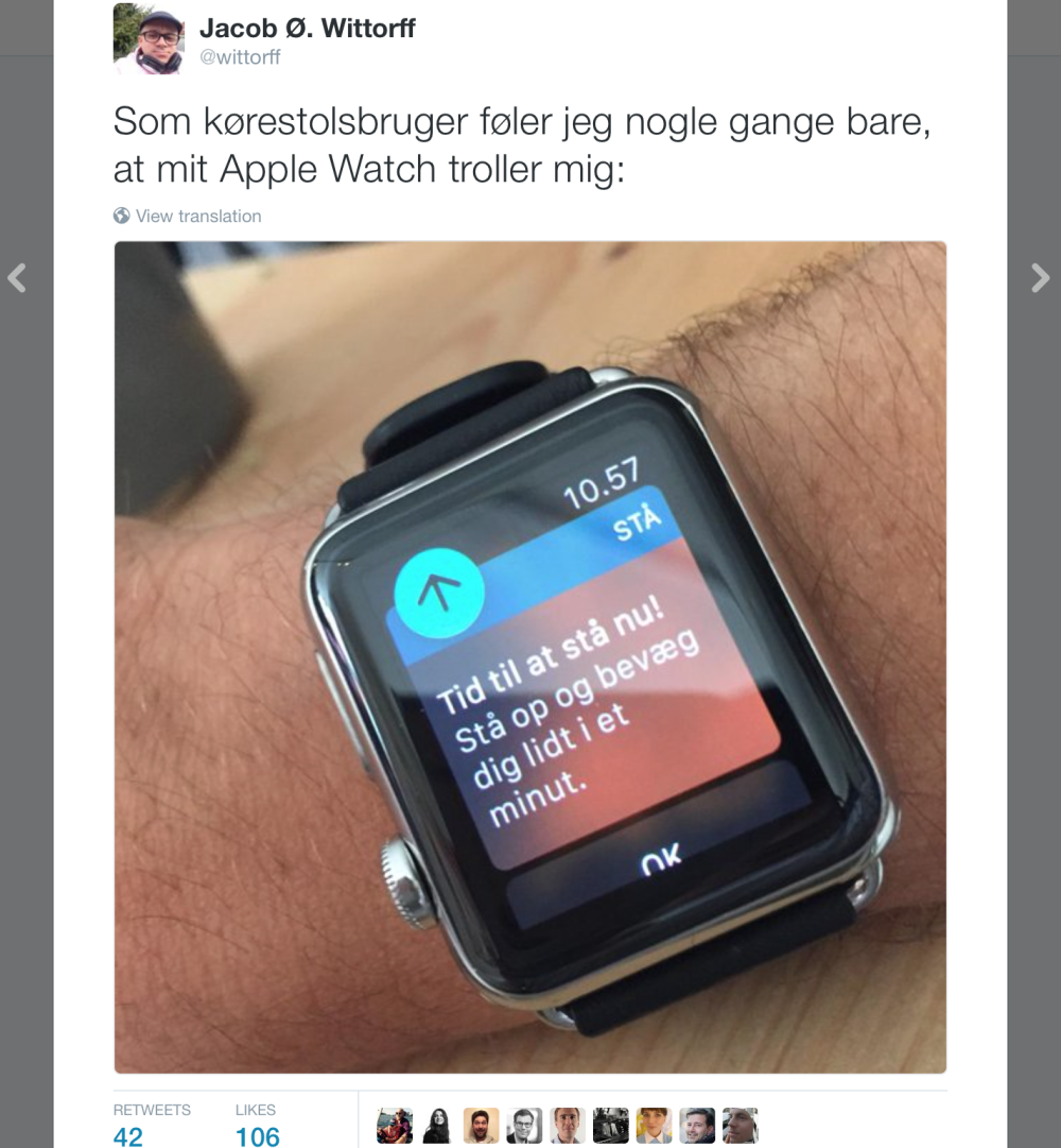 Jeg er kørestolsbruger og ejer et Apple Watch, og det betyder, at jeg mange gange dagligt får en notifikation på mit ur, der fortæller mig, at det "er tid til at stå."