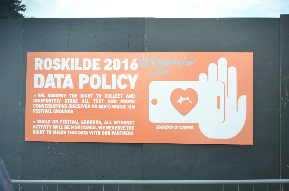 Flere steder på Nordens største festival i Roskilde hænger der skilte, som fortæller de knap 130.000 deltagere om, hvordan deres mobildata, internetsøgninger og samtale-metadata bliver opsamlet, gemt og delt med eksterne partnere.