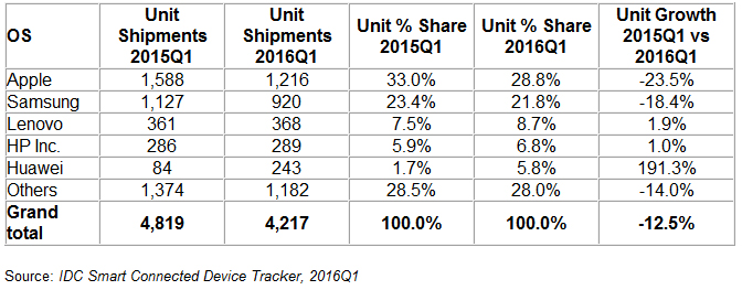 For mens begge selskaber stadig er langt, langt foran konkurrenterne, hvad angår forsendelserne til Danmark, Norge, Sverige og Finland, så har både Apple og Samsung oplevet lidt af en nedtur fra første kvartal 2015 til første kvartal i år.