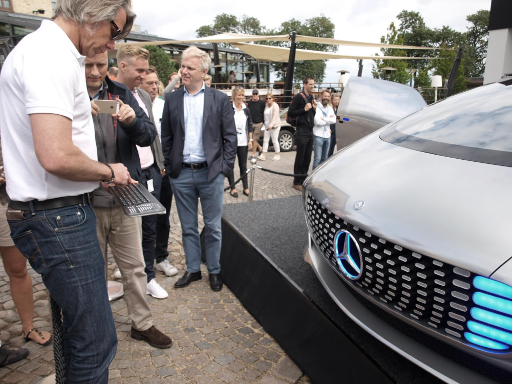 Der står den så pludselig på et podie i en gade i Båstad i Sverige og lyser blåt - den stålgrå vision om en bil, som Mercedes-Benz kalder F015 Luxury in Motion, og som mange måske har læst om eller hørt om, men kun de færreste har set i virkeligheden.