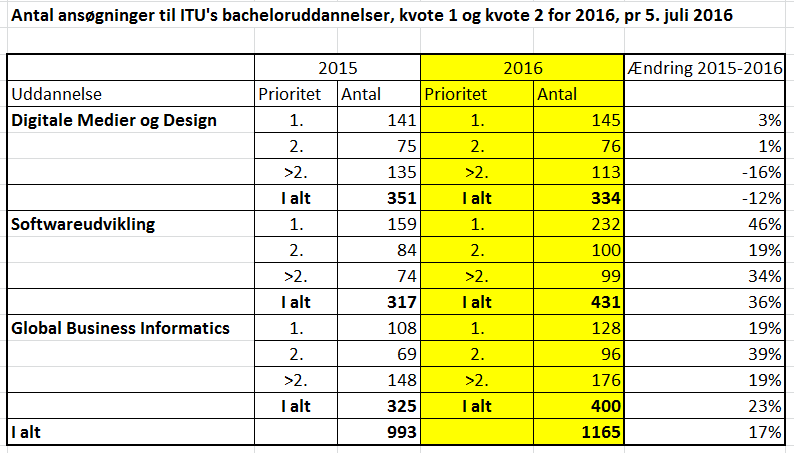Samlet set bliver der optaget 1.165 elever på de tre uddannelseslinjer, hvilket betyder, at det totale antal ansøgninger til ITU's tre bacheloruddannelser slår rekord.