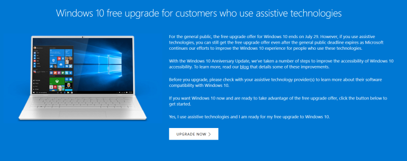 Flere amerikanske medier skriver, at du via Microsofts Assessibility Center, der er rettet mod Windows-brugere med et handikap som for eksempel stærkt nedsat syn, stadig gratis kan hente en opgradering til Windows 10 fra Windows 7 eller 8.1.