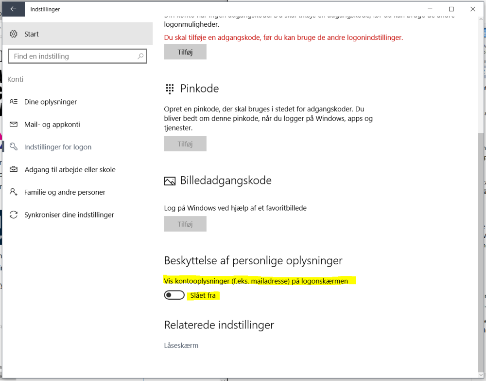 For at fjerne din emailadresse fra login-skærmen: Gå ind i Indstillinger > Konti > Indstillinger for Logon.