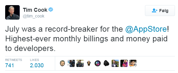 Æblefirmaets boss, Tim Cook, meddeler på Twitter, at App Store har slået rekord i juli, både når det handler om fakturering og om de kontanter, der udbetales til udviklerne.