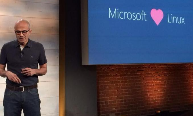 På billedet ses Microsofts chef Satya Nadella foran en skærm med det slet skjulte budskab om, at Microsoft elsker Linux.