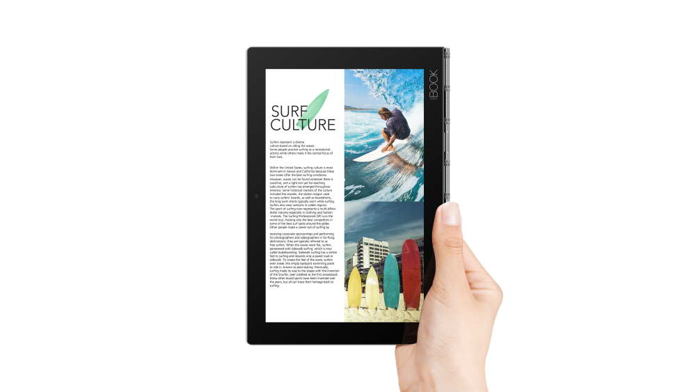 Tablet-computeren på 10" ligner Lenovos Yoga-computere, hvor du ved at "vende vrangen ud på computeren", og flippe skærmen 360 grader rundt, omdanner computeren til en tablet.
