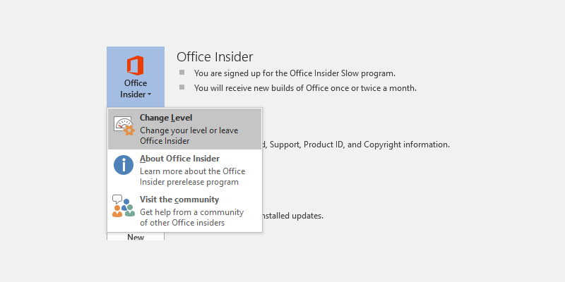 Microsoft skriver i en orientering om de nye muligheder, at man som almindelig Officer Insider automatisk deltager på det langsomste niveau, hvor man man får nye builds en gang eller to om måneden.