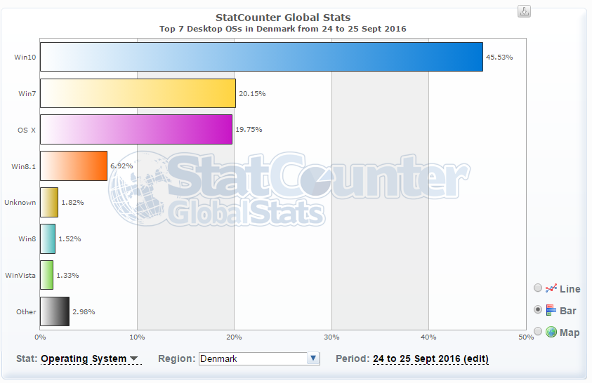 Det kan også ses på antallet af Windows 10-brugere, der udgør over 45 procent af danskernes styresystemer.