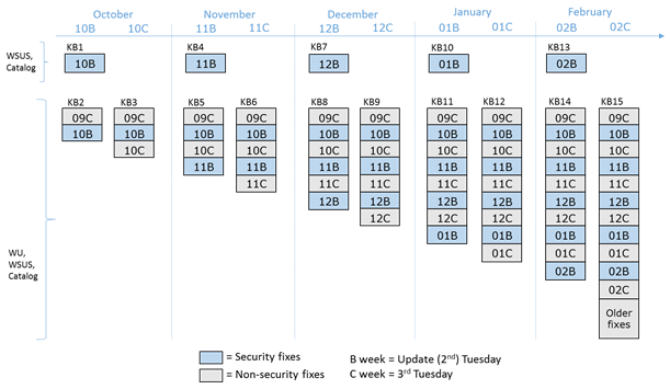 "Hver måned vil der være separate opdateringer af en række grunde (eksempelvis ændringer af DST-tidszone (Daylight Saving Time), ekstraordinære sikkerhedslapper). Mange af disse vil blive opsamlet i den næste månedlige opsamling, selvom nogle vil forblive separate - inklusive Office, Flash og Silverlight-opdateringer."
