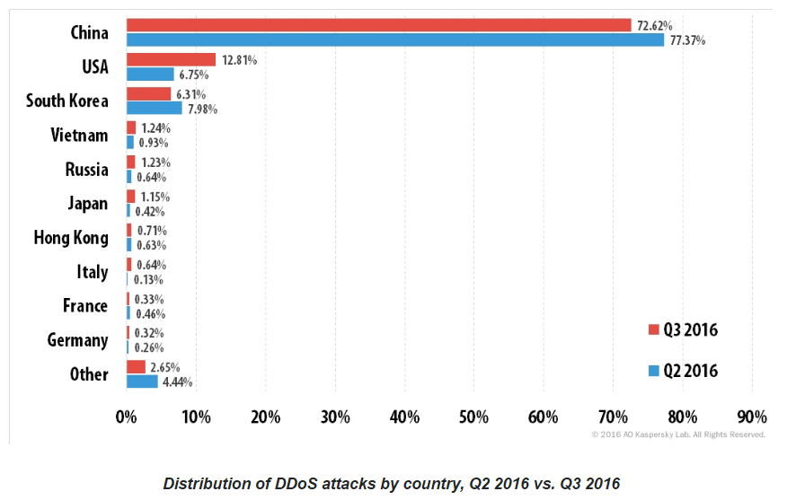 Sikkerhedsfirmaet Kaspersky har i en ny rapport opgjort hvilke lande, der blev plaget mest af DDoS-angreb i det tredje kvartal af 2016.