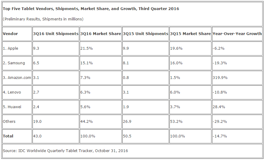 Til gengæld var der masser at juble over hos Amazon, der har øget tablet-forsendelserne med hele 319,9 procent over det seneste år.
