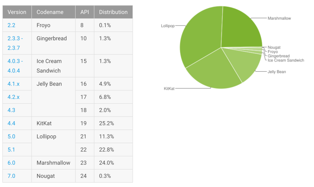 I øjeblikket er der 0,3 procent af alle Android-telefoner, der er udstyret med Android 7.0, 24 procent med Android 6.0 (Marshmallow), 34,1 procent med Android 5.0 (Lollipop) og 25,2 procent med Kitkat.
