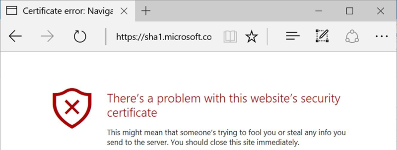 "Fra den 14. februar 2017 vil Microsoft Edge og Internet Explorer 11 forhindre sider, der beskyttes med SHA-1-certifikater, i at loade og vil vise en advarsel om ugyldige certifikater."