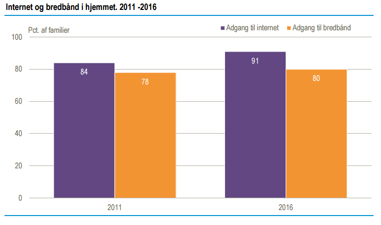 I 2016 er 80 procent af familierne således opkoblet til internettet. Langt de fleste internetforbindelser er bredbåndsforbindelser med høj hastighed.