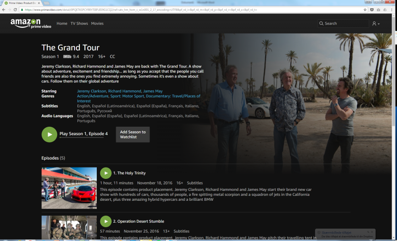 Prime Video er desuden også stedet hvor du kan se de tre tidligere Top Gear-værter, Jeremy Clarkson, James May og Richard Hammond, slå sig løs i deres nye bilprogram The Grand Tour.