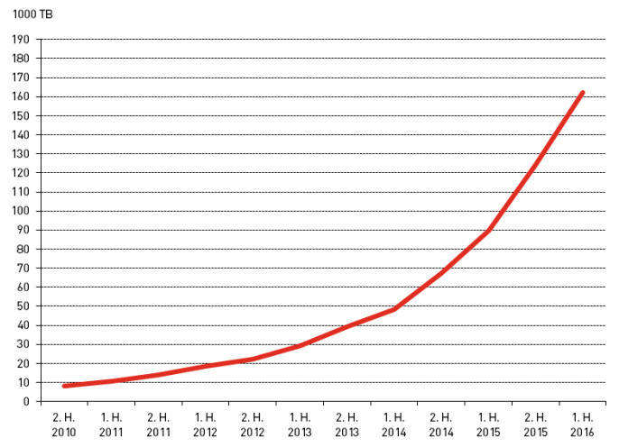 "Stigningen i den samlede mobile datatrafik har været på lidt under 73.000 TB fra første halvår 2015 til første halvår af 2016, hvilket svarer til en stigning på 81,2 pct. Dermed endte den mobile datatrafik på lidt over 162.000 TB i første halvår 2016."