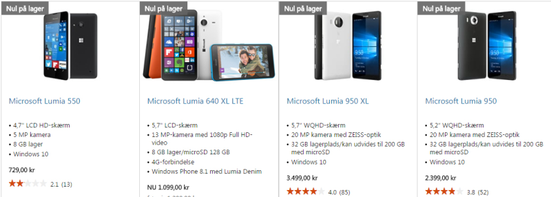 Også i den danske del af Microsoft Store mødes man under Lumia-kategorien med beskeden "nul på lager".