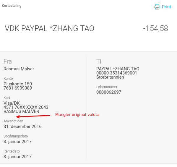 Fordyrelsen skyldtes, at betalingen mod Rasmus Malvers ønske blev gennemført via PayPal i danske kroner.