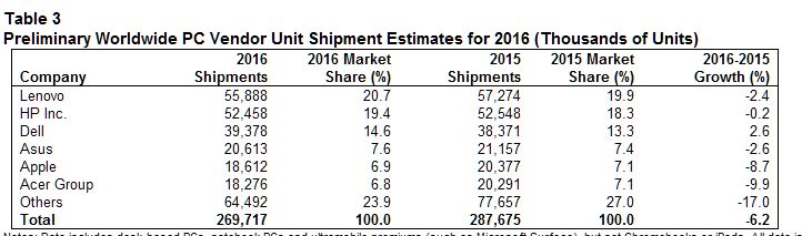 Ifølge Gartner har Acer og Apple haft de største procentvise tilbagegange i forhold til 2015.