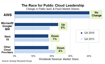Microsoft, Google og IBM vinder frem på det globale marked for public cloud-tjenester, hvor de i det seneste år tilsammen er gået fem procent-point frem.
