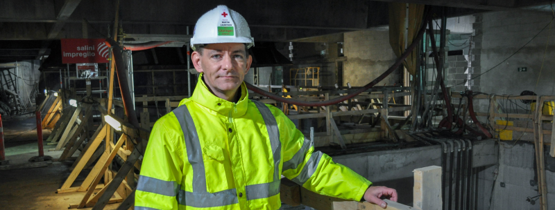 "Ind i mellem skal vi være kreative i en fart, fordi hver dag, hver time og hvert minut koster mange penge. Så nytter det altså ikke noget, at vi først skal have et grundkursus i at bygge it-infrastruktur," siger Martin Lauritsen nede i hullet, der en dag bliver til Københavns Hovedbanegårds Metrostation.