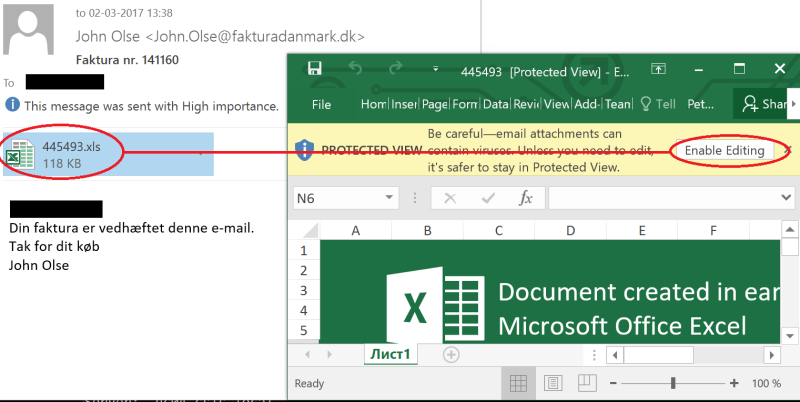 Hvis denne fil åbnes af en uforsigtig modtager og får en tilknyttet makrokode aktiveret ved at slå Excels beskyttelsestilstand fra, vil brugeren ende med en krypteret computer.