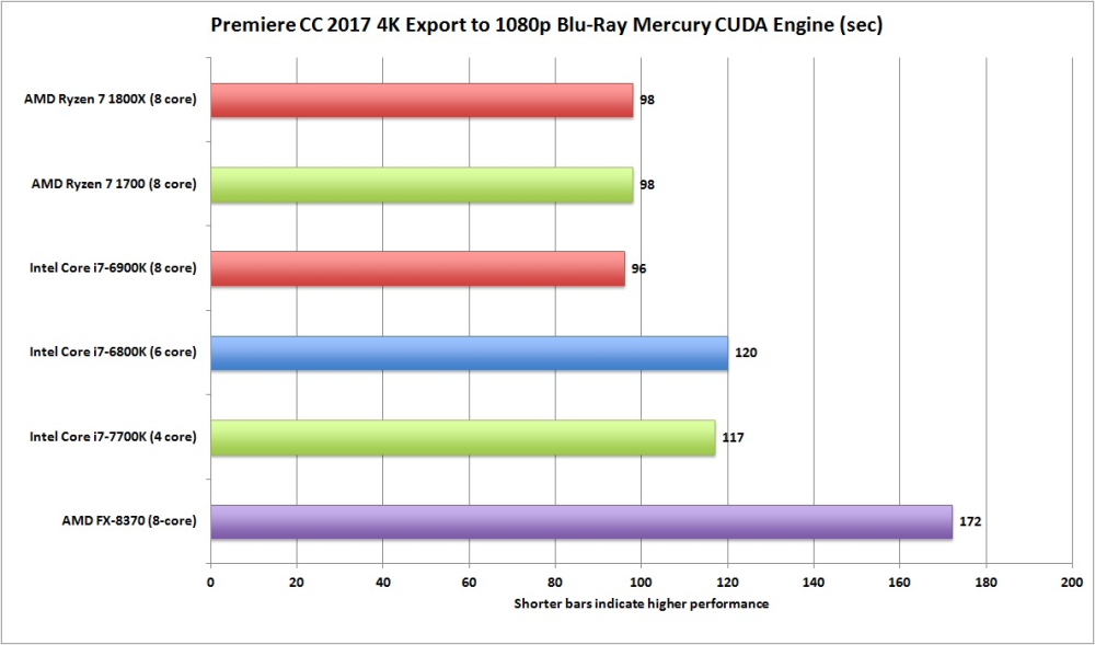Benytter du kun CPU'en, er Ryzen 7 1800X igen hurtigere end Intels 4.000 kroner dyrere i7-6900K med Ryzen 7 1700 lige i hælene.