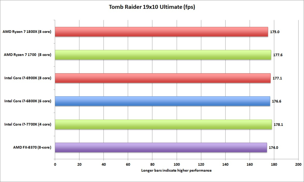 Det er direkte underligt. Det er selvfølgelig ikke mærkbart i spillet, når frameraten ligger mellem 300 og 500, men ikke desto mindre er det et underligt, at AMD Ryzen 7 1800X har matchet og slået Intels 6900K i tidligere tests, men falder tilbage i disse.