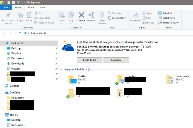 Den seneste reklame er placeret over dine mapper i File Explorers startside og reklamerer for lagerplads i Microsofts sky, OneDrive og Office 365.