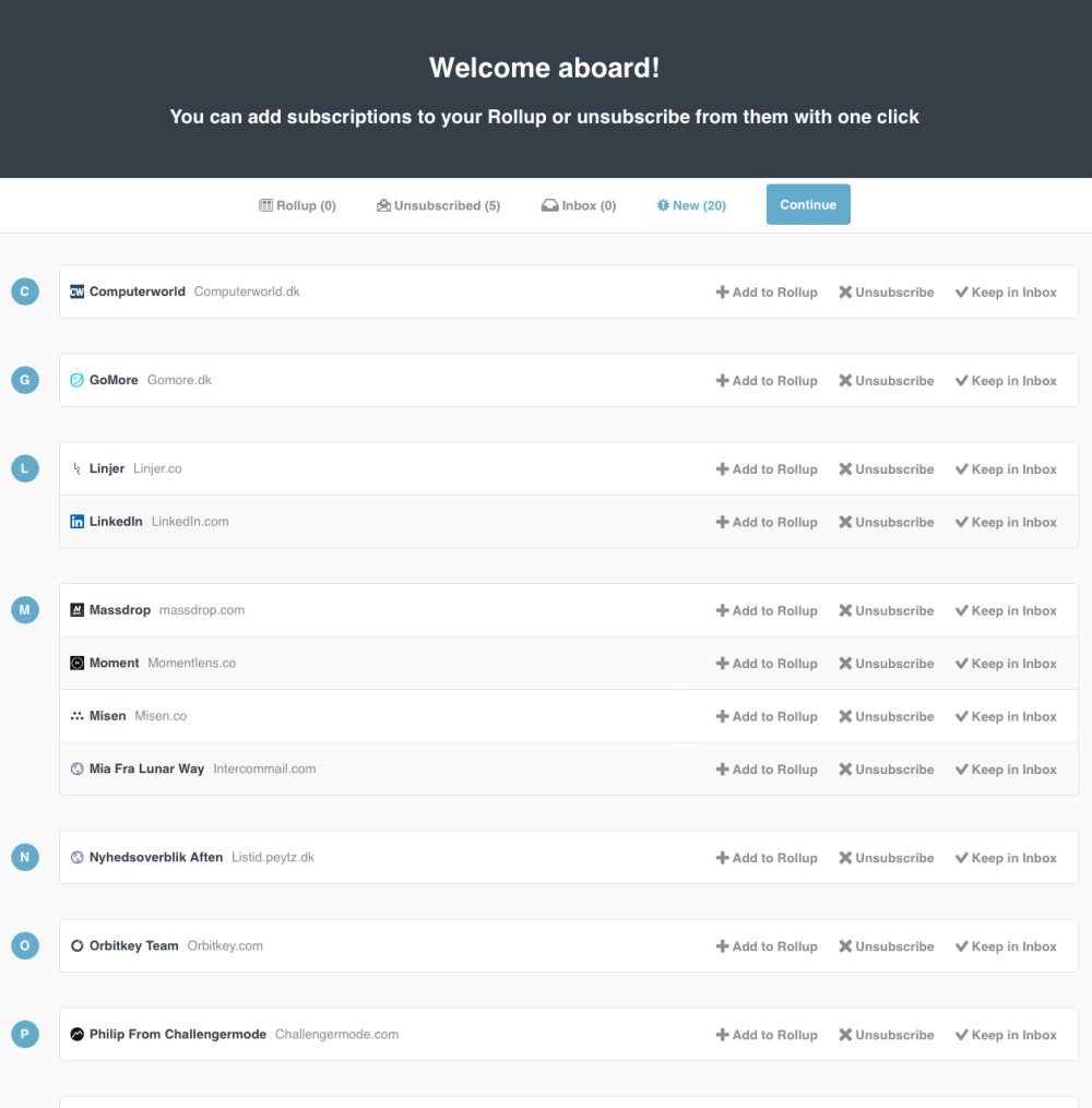 Du logger ind på Unrolls hjemmeside med din Google, Yahoo eller Outlook, hvorefter du ser en lang liste af dine tilmeldte nyhedsbreve, som du efterfølgende kan fra- eller tilvælge.