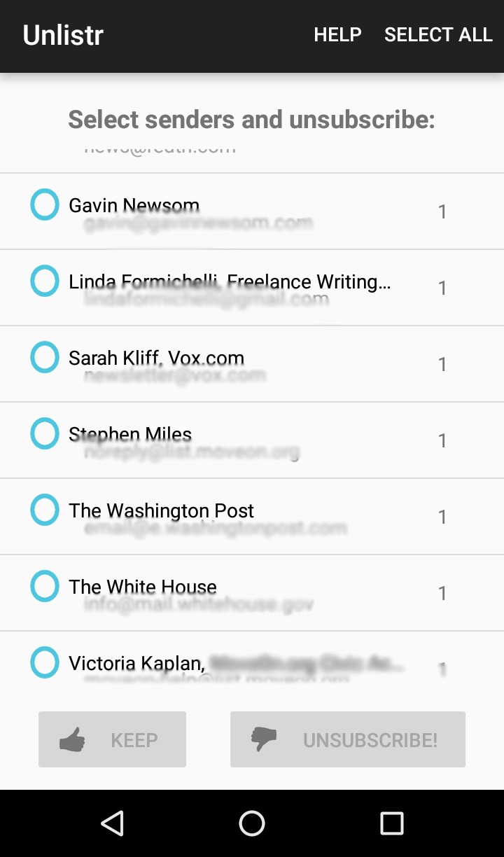 Efter du har skrevet dine mail-informationer ind i appen, får du en liste over alle de mails, du med tiden har skrevet dig op til. Herefter kan du let vælge at beholde eller framelde dig mails på listen.