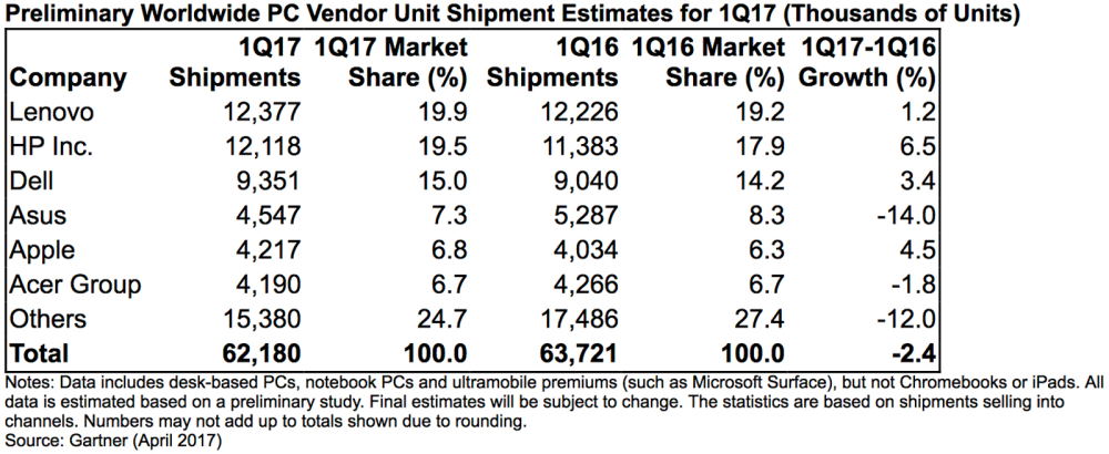 Her estimerer analysehuset, at salget af pc'er i første kvartal 2017 er faldet 2,4 procent, og at pc-salget for første gang siden 2008 kommer ned under 63 millioner solgte enheder i et enkelt kvartal (ifølge Gartners tal).