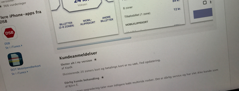 "Jeg mistede mit tog og forbindelsen bagefter, fordi jeg blev nægtet adgang til app'en. Inden jeg fik adgang, blev jeg tvunget til at downloade en opdatering i App Store og "sign up" i app'en, som krævede en kode, som jeg skulle vente på at få tilsendt per SMS. Først derefter fik jeg lov til at købe billet."