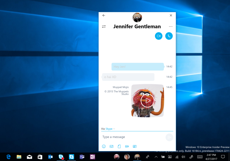 Trykker du på en af dine venners billeder, får du en oversigt over oplysninger på personen samt mulighed for at skrive direkte til personen. Som udgangspunkt benytter My People Skype. Du får også vist andre apps såsom OneDrive og mails, så du let kan få vist fælles mapper eller alle modtagne og sendte mails til personen.